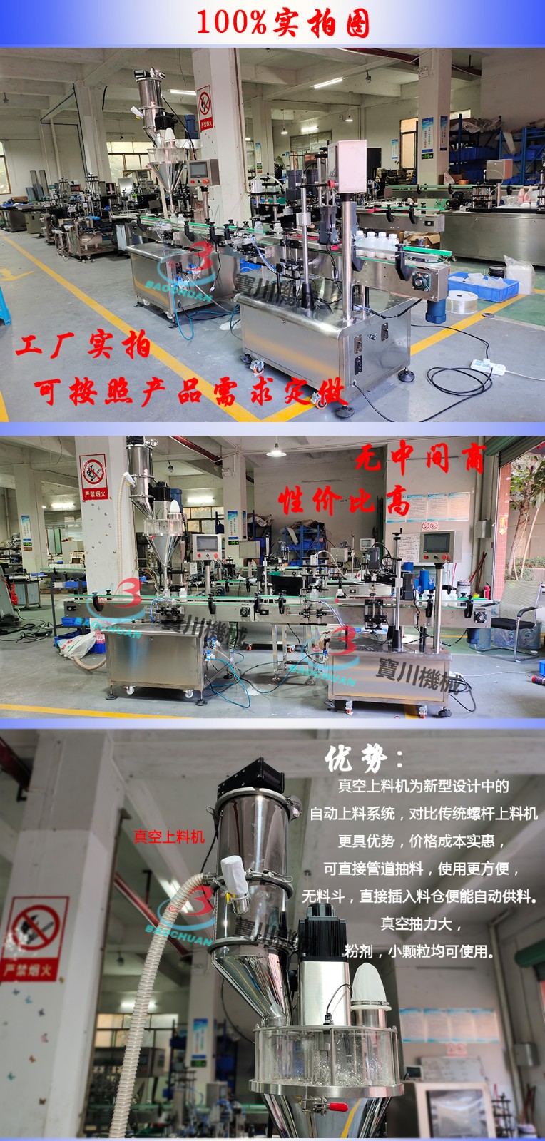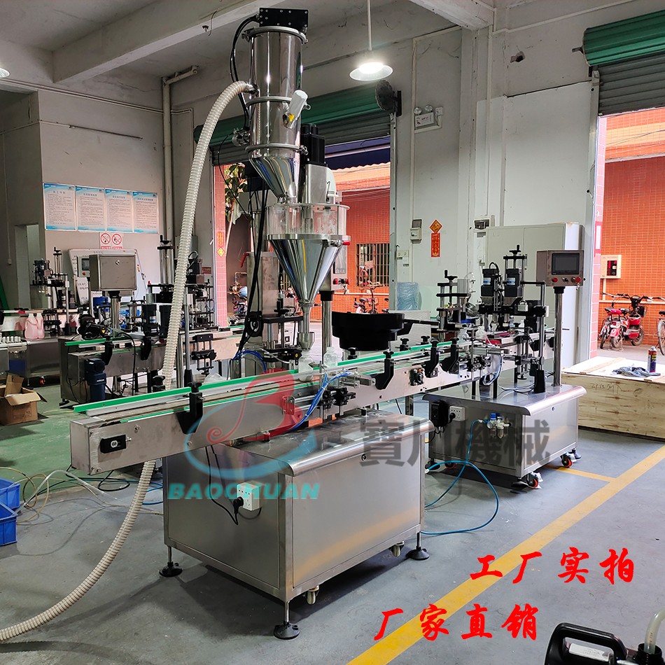 該機(jī)是一款經(jīng)濟(jì)適用的粉末及小顆粒自動(dòng)灌裝機(jī),能完成瓶子自動(dòng)定位,充填及計(jì)量等工作,該機(jī)由一個(gè)充填頭,一臺(tái)鏈板輸送帶及一個(gè)定位裝置組成,采用伺服﹙或步進(jìn)﹚馬達(dá),PLC及觸摸屏控制,操作簡便,穩(wěn)定性高??膳c理瓶機(jī)、旋蓋機(jī)、貼標(biāo)機(jī)等組成整套灌裝流水線。適用于包裝粉末及小顆粒物料,如粉劑、小顆粒劑藥品、獸藥、葡萄糖、調(diào)味品、固體飲料、碳粉、爽身粉、農(nóng)藥等。